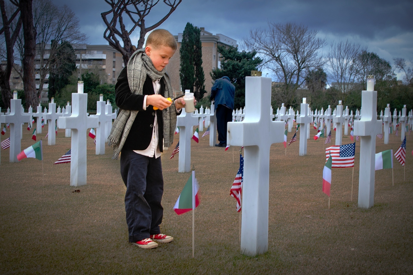 Mi piace la luce che si vive in questa fotografia. La presenza discreta ma partecipe del ragazzetto infonde un bel senso di amore e solidarietà per i tanti martiri delle guerre.
