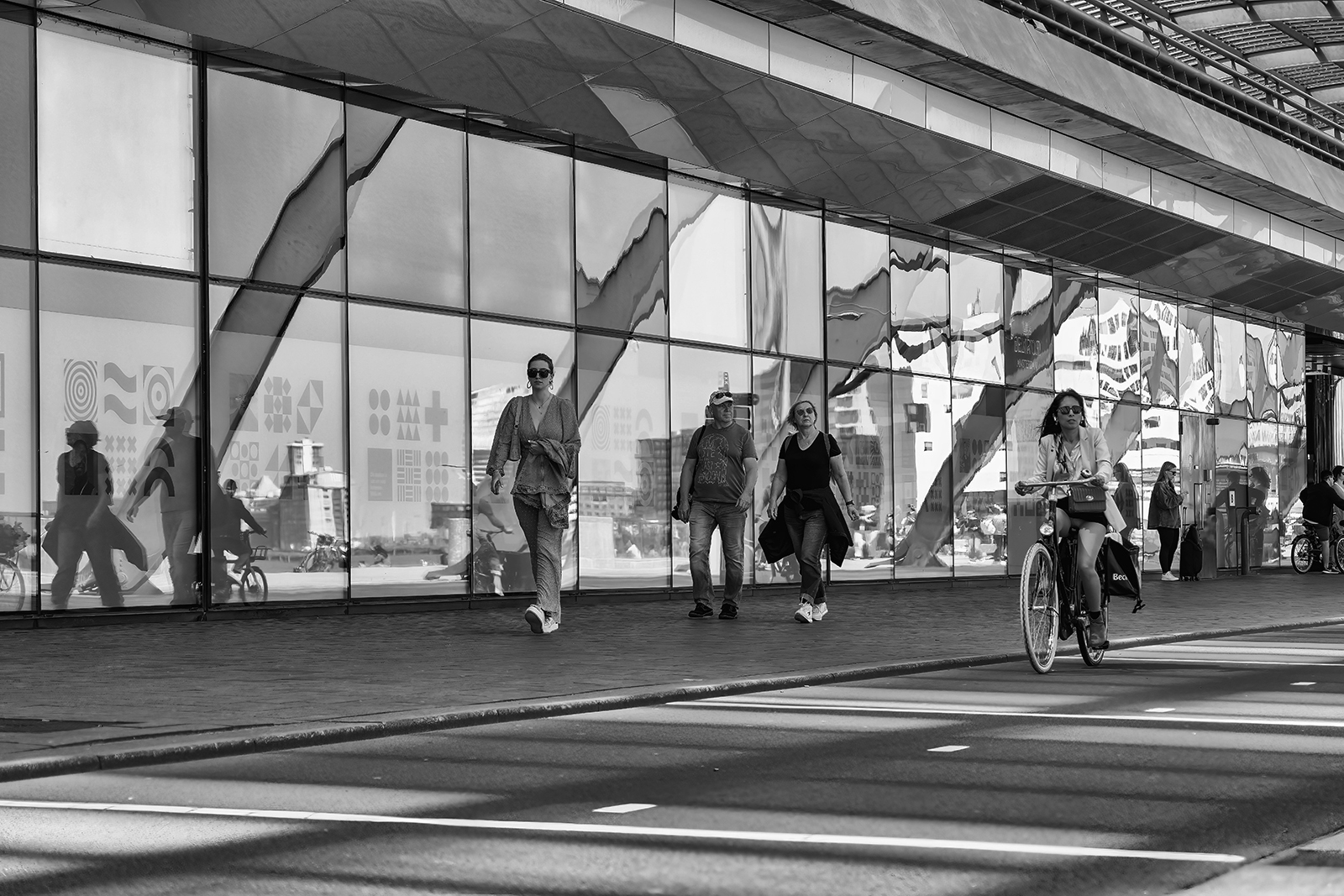 Un fermo immagine che ritrae uno spaccato di vita quotidiana comune a tante città. Interessante il gioco dei riflessi e l'ottimo bn. Ciao