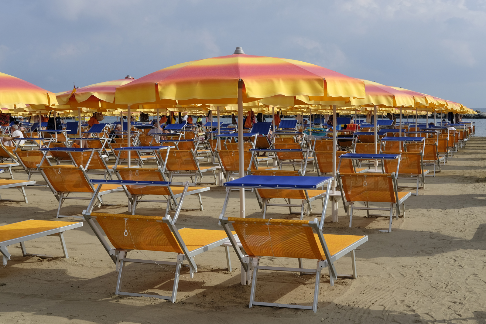 ecco l'opposto della spiaggia libera, un esercito di ombrelloni e sdrai tutti inquadrati ed allineati, spiaggia suddivisa millimetricamente. Buona l'inquadratura in diagonale che dona profondità ed i toni che trovo naturali