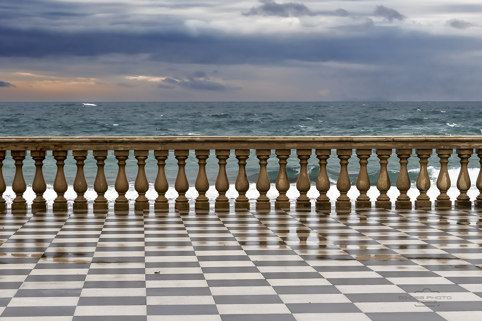 sempre di grande fascino questa terrazza sul mare, qui amplificata dal riflesso sulla pavimentazione a scacchi. Bello in contrasto fra tonalità fredde e calde e la composizione . Una buona foto anche per me