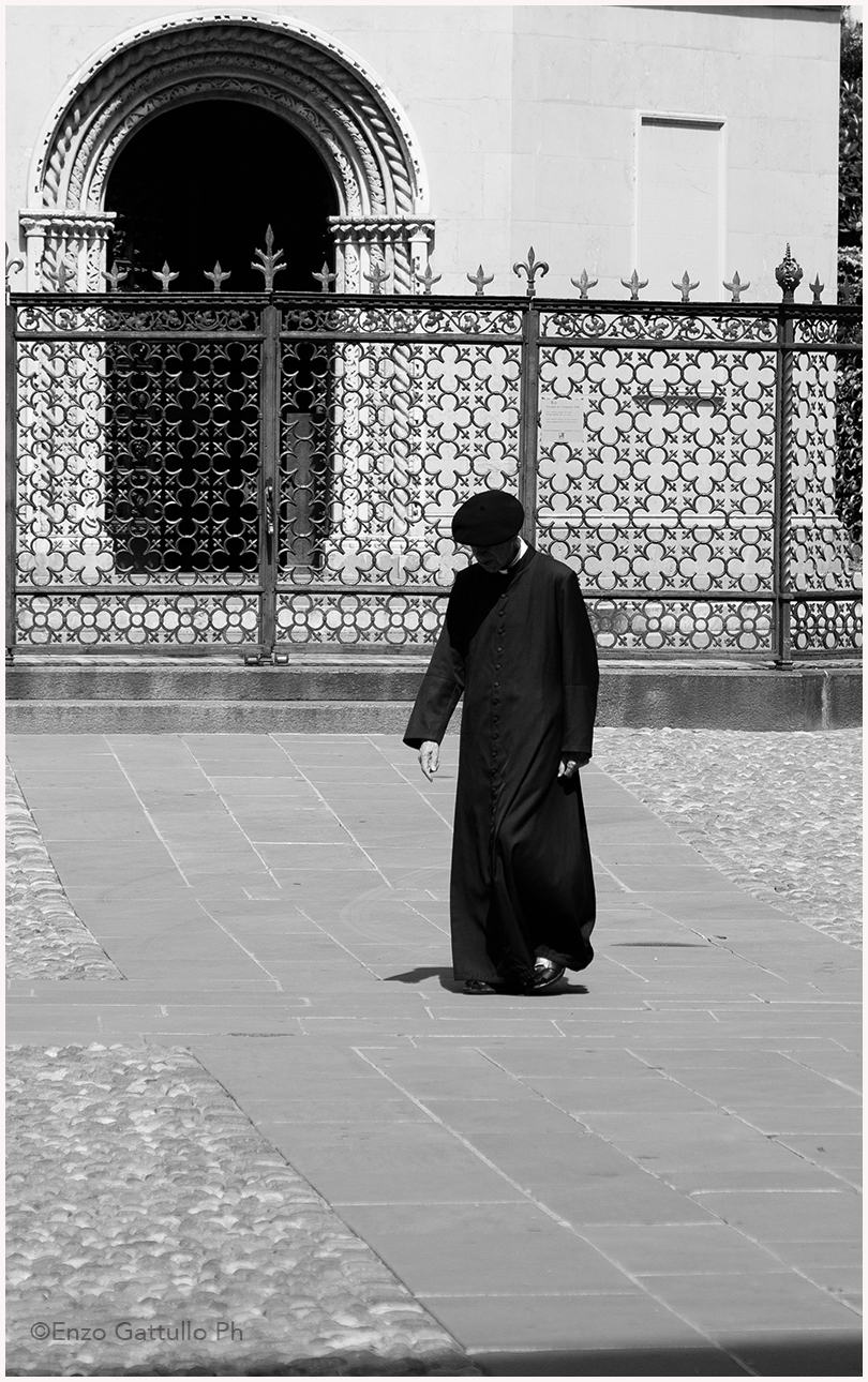 Una figura pesante, quasi sofferente per la propria solitudine, il volto oscurato... l'opposto dei pretini di Giacomelli che giocavano scanzonati sulla neve.