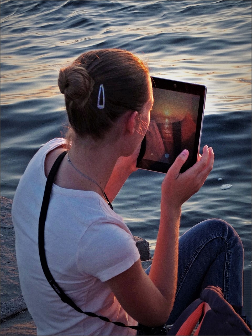 Fotografia del tramonto piacevole perchė diversa dalle solite e mediata dalla figura umana e dal suo tablet, con ripresa istantanea e naturale. Ciao, Francesco _________________ Fotocamere Olympus OMD e PEN, Panasonic G3. Software GIMP