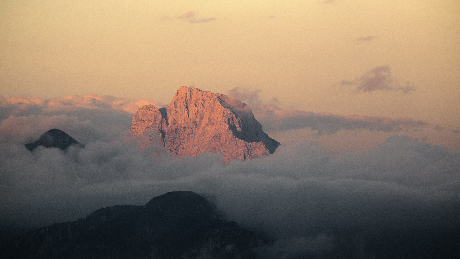 Uno scenario suggestivo e pieno di fascino che non capita certo di poter ammirare tutti i giorni, la cima che svetta tra le nubi e la tinta rosata sono una vista impagabile.