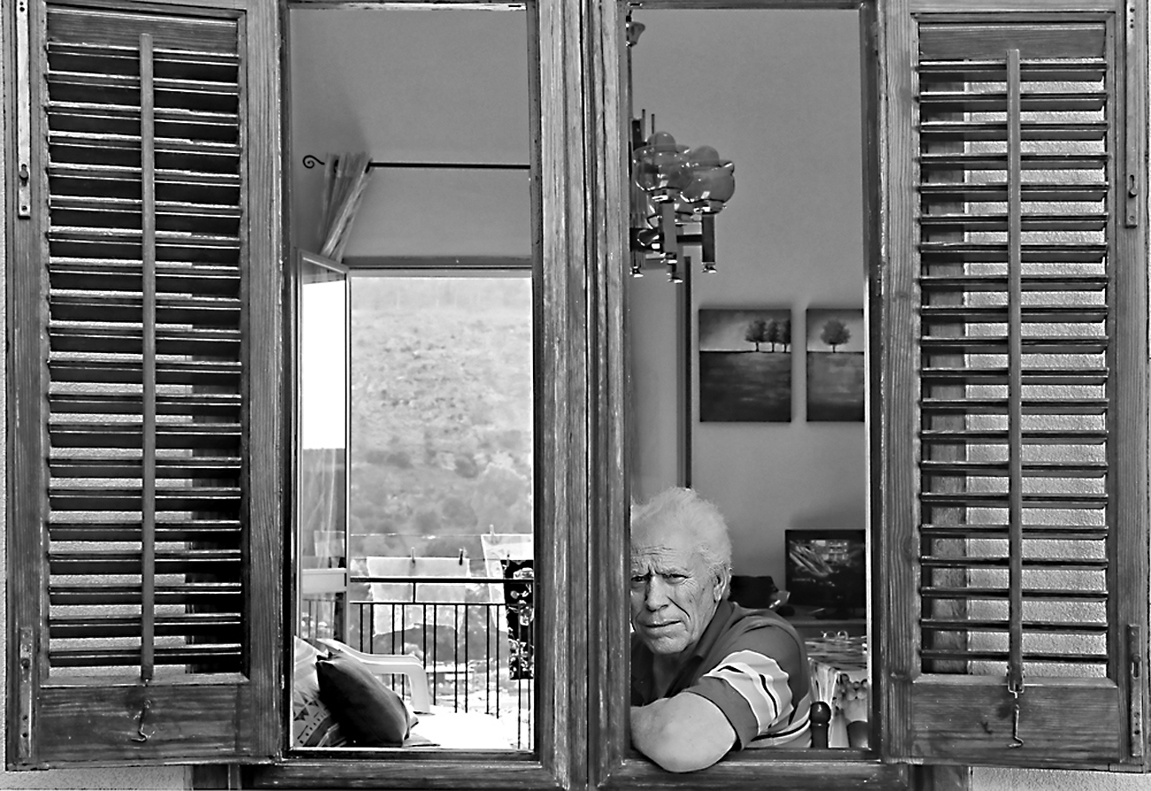 Lo scatto ci fa vedere l'uomo che scruta dalla finestra priva di vetro con il braccio appoggiato che fuoriesce all'esterno e che rende lo scatto tridimensionale.