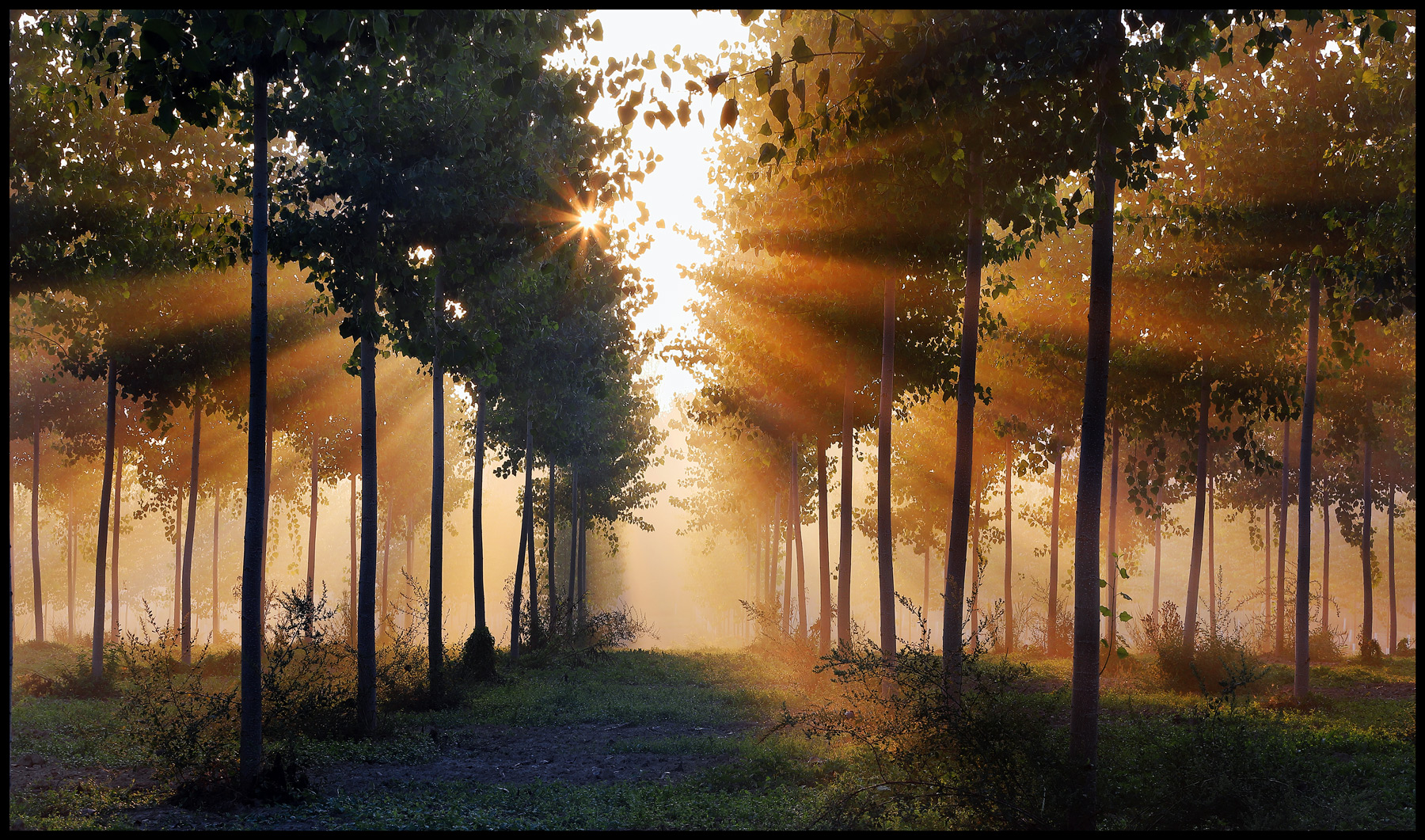Il sole a stella irraggia la sue calda luce tra i pioppi e la leggera foschia rende quasi tangibile ogni singolo raggio, un bellissimo effetto.