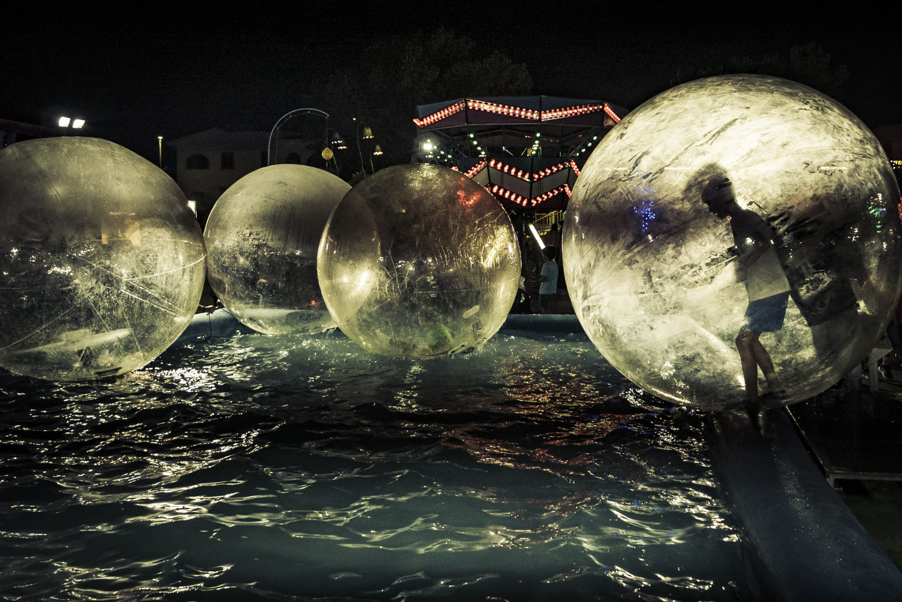 Inquietante! La deformazione delle sagome dei bambini, data dalle sfere e dalle ombre, mi ha fatto pensare a feti fluttuanti nell’utero… Per fortuna le luci rosse sullo sfondo la riportano ad un’immagine di gioco… Smile Ottima gestione di luce e nitidezza, davvero un’immagine coinvolgente Ok!