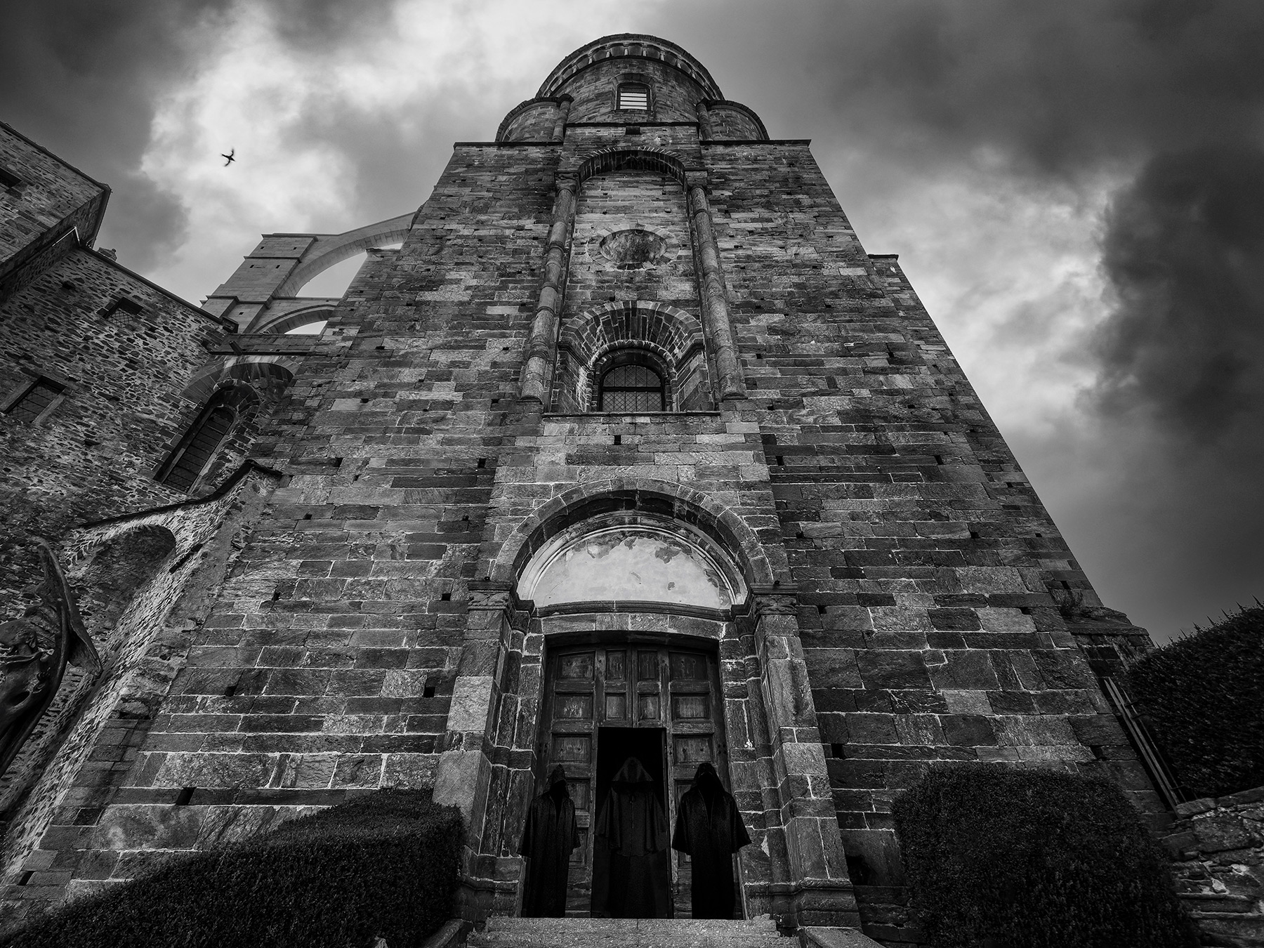 Un edificio non troppo rassicurante dalla grande ed incombente verticalità, un bianco e nero dai toni cupi a cui si aggiungono il minaccioso cielo e gli spaventosi incappucciati