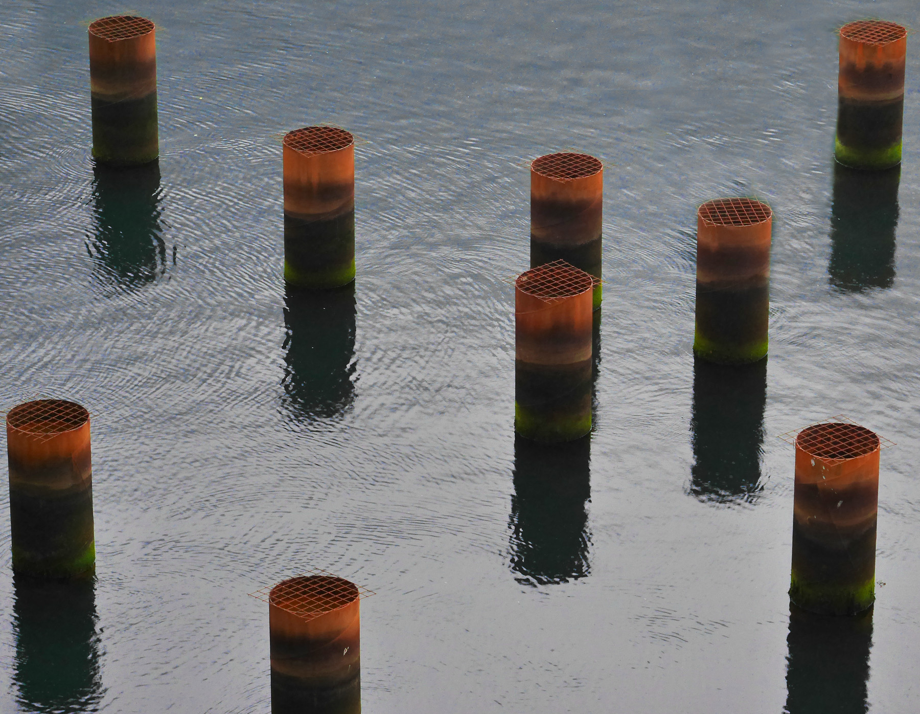 Questi curiosi cilindri che sbucano dall'acqua con i loro colori, la loro ombra riflessa e la loro apparente disposizione casuale riempiono molto bene il fotogramma ed appagano lo sguardo.