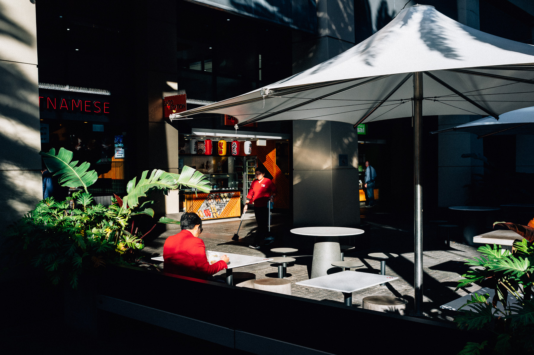 Uno scorcio di vita quotidiana, all'apparenza banale, ma che grazie al contrasto di forti luci e zone in ombra crea un risalto cromatico che rende la scena molto immersiva.
