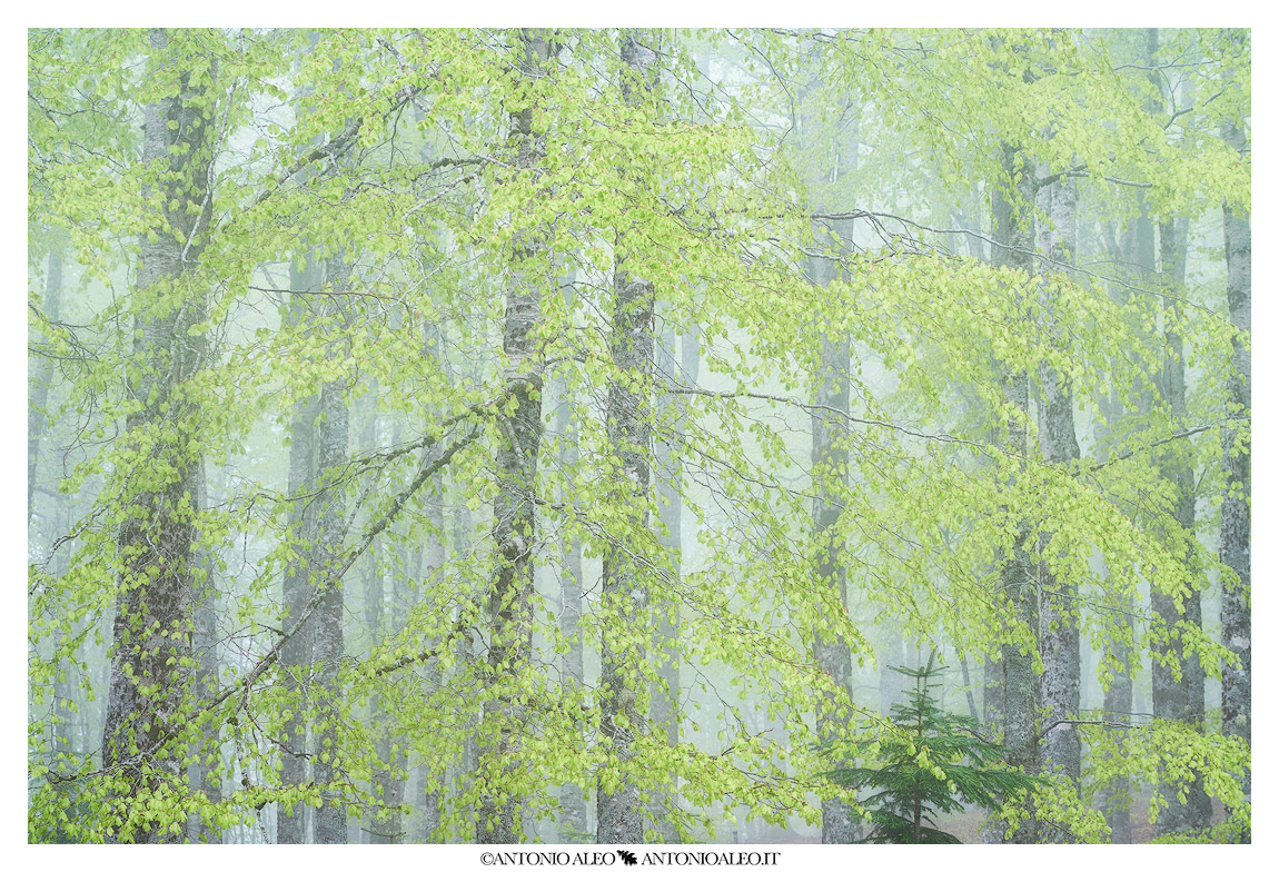 Questa miriade di foglioline verdi che si stagliano sui tronchi avvolti dalla nebbia sono una visione soave ed ammaliante, volendo essere pignoli la punta verde in basso a destra sa di intruso ma non credo infici l'encomiabile risultato finale.