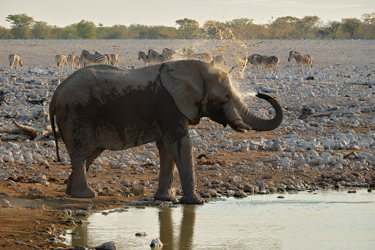 Un bellissimo controluce che ben evidenzia lo spruzzo rinfrescante, bello pure lo sfondo che racconta la vita della savana.