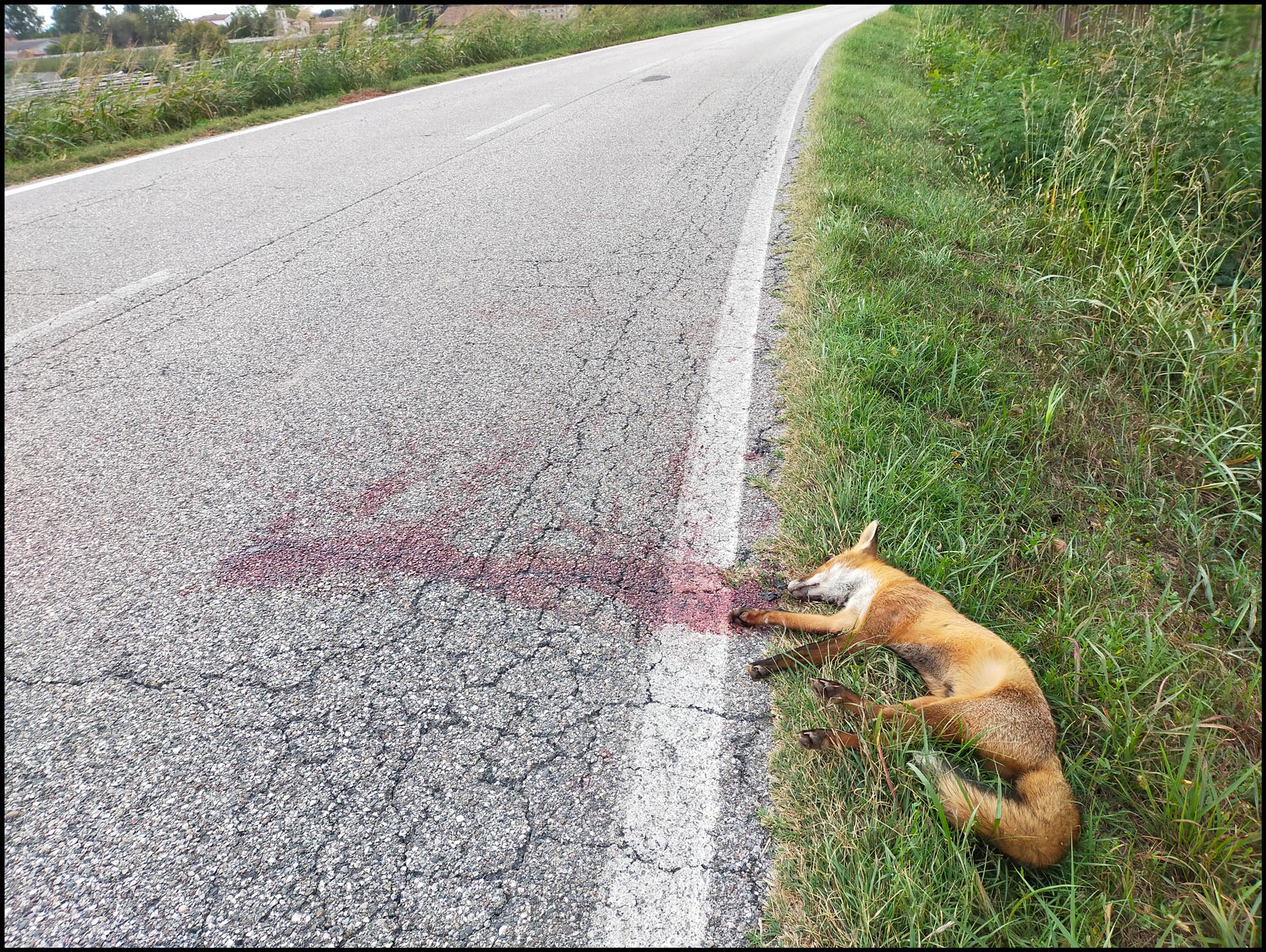 Una foto che colpisce. Provo un forte dispiacere interiore per questo bell'esemplare di Volpe finito così. Meriterebbe almeno degna sepoltura.