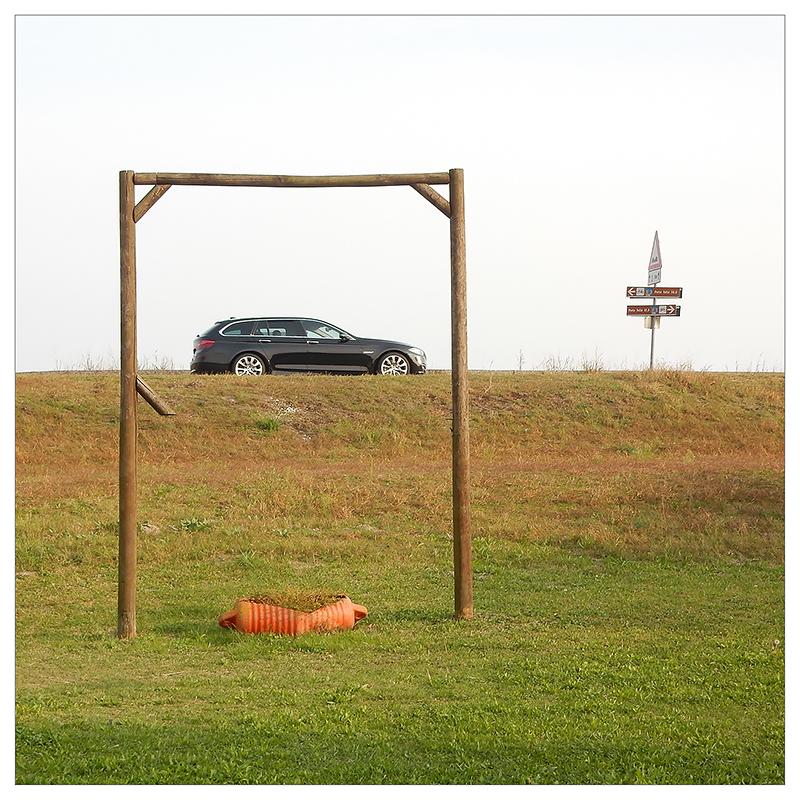 Il telaio incompleto inquadra la macchina lustra, una boa riciclata in vaso, segnaletica persa nel nulla e un prato che arrossisce.
