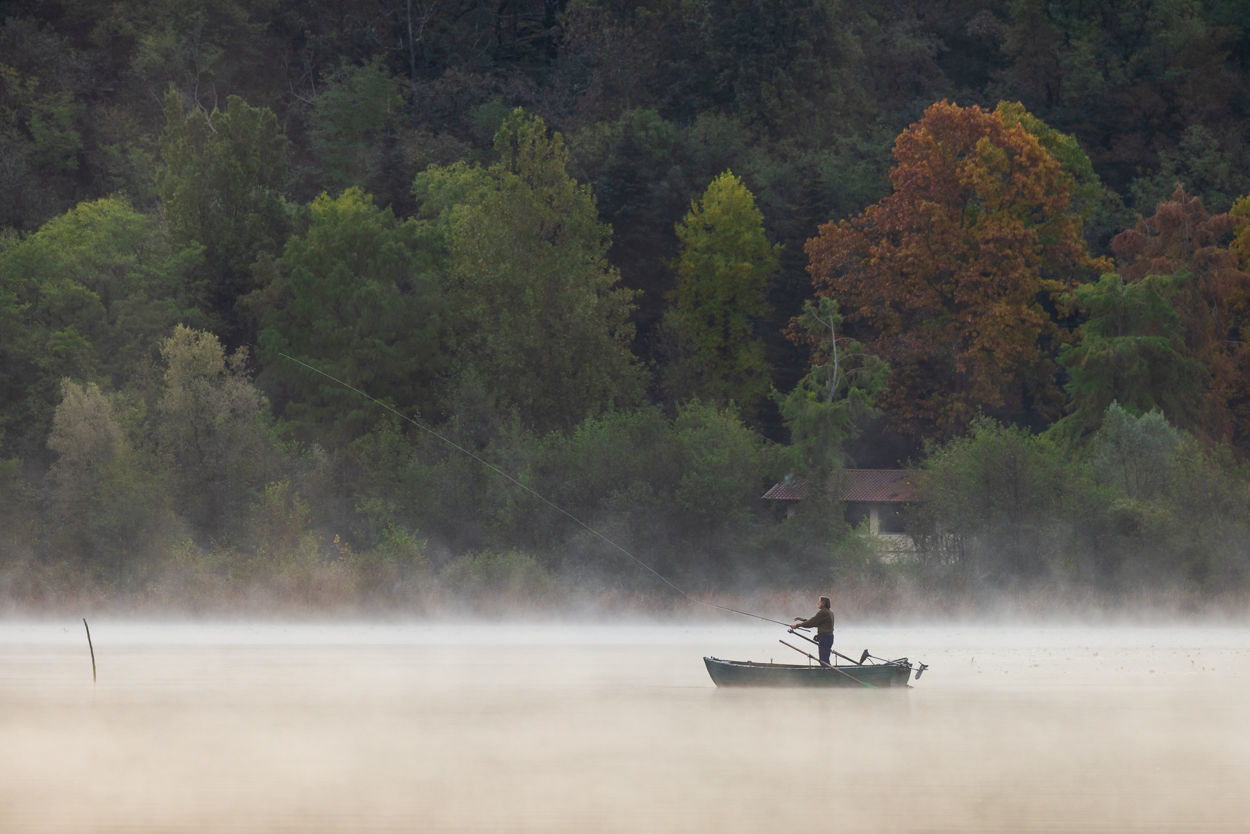 Hai scelto il momento giusto per scattare, la lenza in volo è un plus non da poco. I colori autunnali su di uno preponderante sfondo e nebbia compresa completano un bellissimo quadro