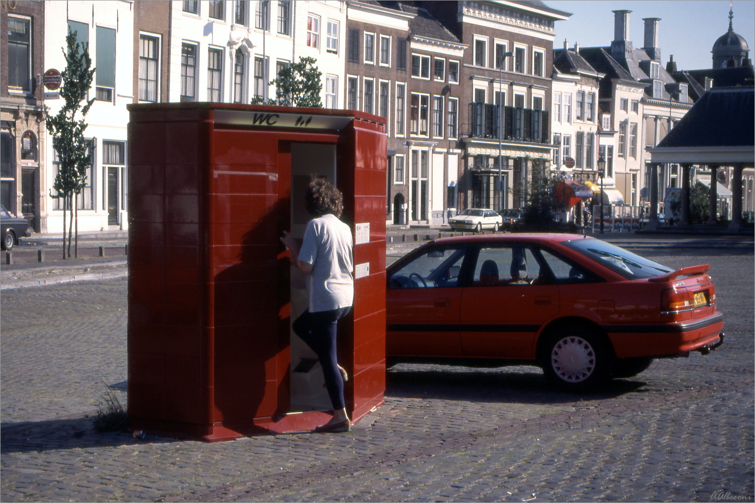 Simpatica la scena con il bagno pubblico al centro della piazza e la donna che ci parcheggia di fianco, in una probabile situazione di emergenza.
