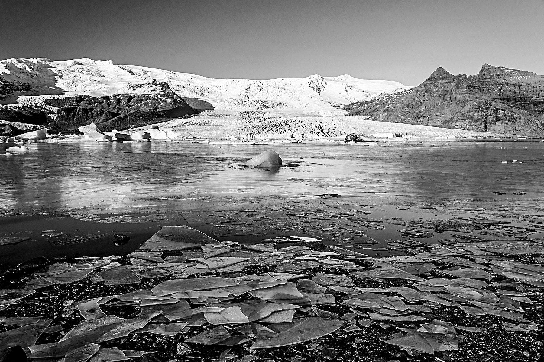 Bello questo bianco e nero ricco di dettaglio e di contrasto, fantastico il primo piano con le lastre di ghiaccio. Scurendo il cielo sono comparsi gli odiosi artefatti.