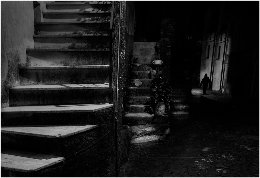 Interessante, così, immersa nel buio, percorsa dalla successione delle tre scalinate, con quella "presenza" che si staglia contro le pareti chiare sullo sfondo. Non so quanto sia calzante la collocazione in Street, ma a parte questo uno scatto che si fa guardare.