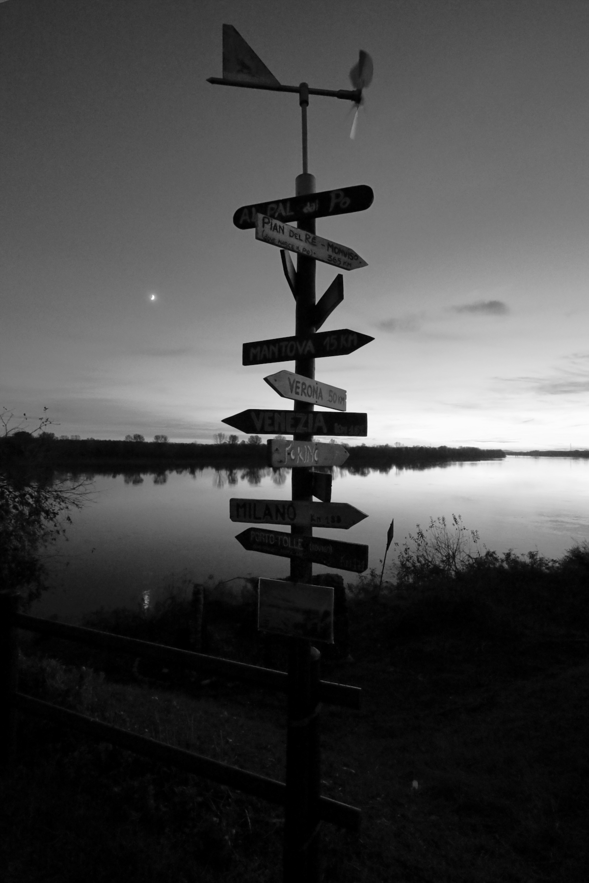 scatto eccellente, le ultime luci della giornata, il fiume che scorre lento e il palo con tutte le indicazioni, che io trovo divertente, ne fotografai uno simile a Lampedusa, la gestione della luce, non semplice, qui la trovo perfetta, bravo Claudio.