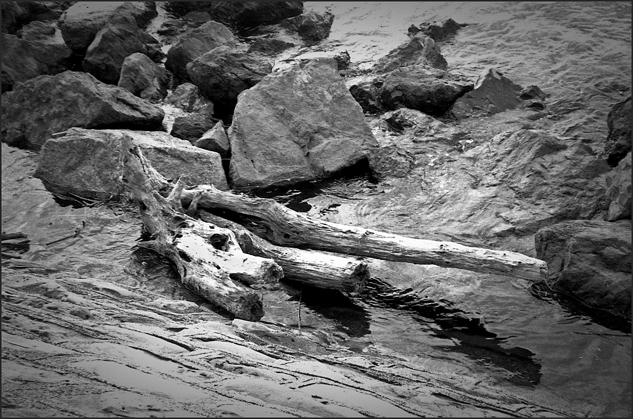 Quel tronco di legno in primo piano sembra un teschio di un animale.
