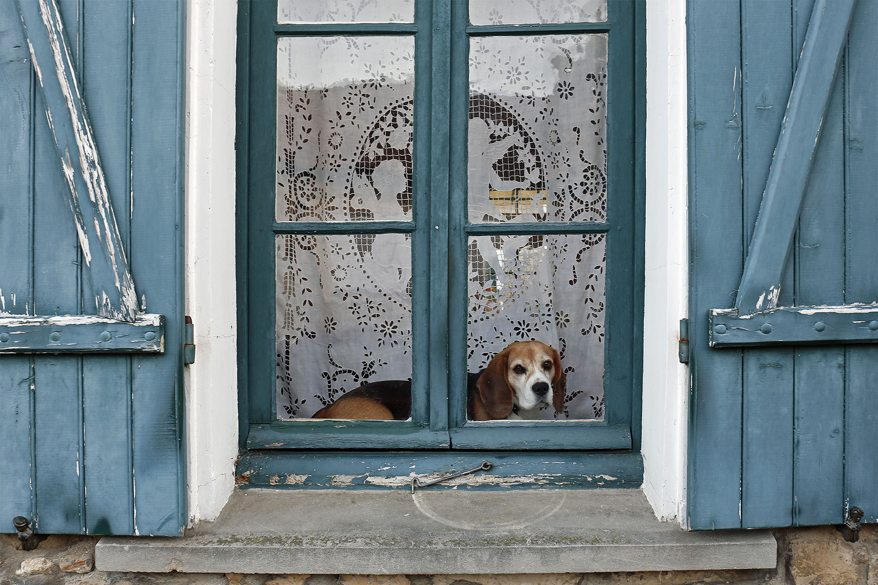 La tendina inamidata con gli angioletti, i serramenti vissuti di un bellissimo colore e il musino curioso del cane col tartufo sul vetro.