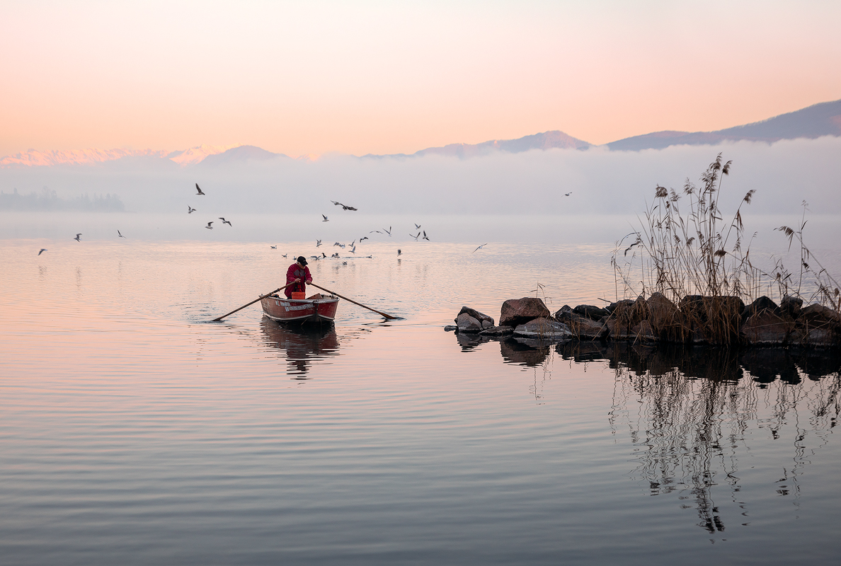 luce rosata e foschia che cela in parte le linee delle montagne, pescatore e gabbiani scogli canne e riflessi sulla acque placide del lago