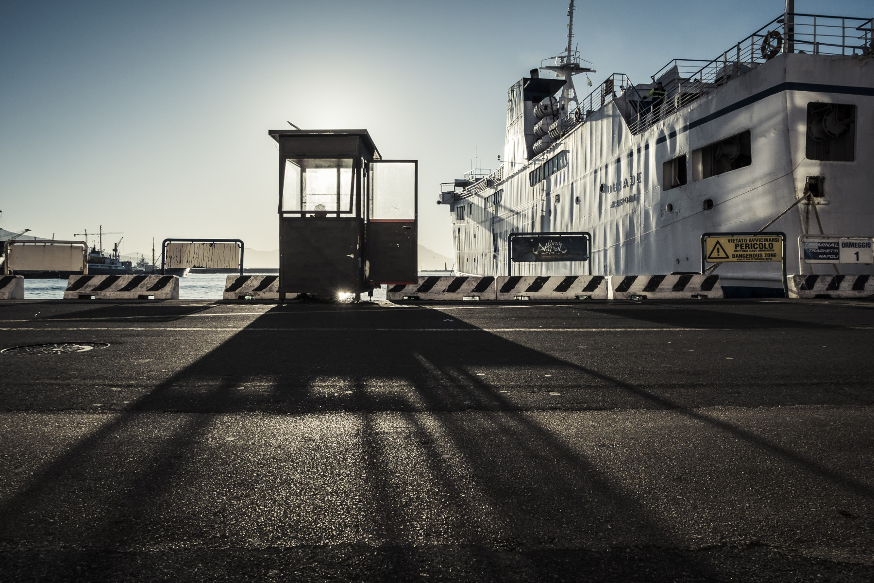 La luce radentissima sulla fiancata della nave quasi la trasforma in cartapesta.