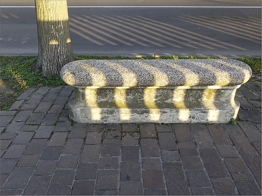 Bellissime le linee disegnate dalla luce che assumono linearità passando dalla panchina alla strada.Fantastico poi lo sguardo accigliato dell'albero.Sempre bravissima. Un caro saluto,Sergio.