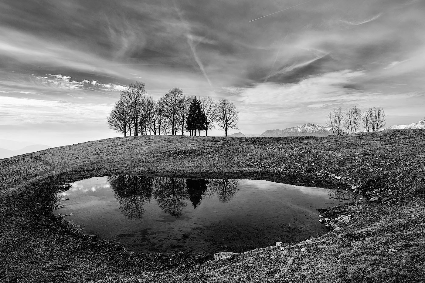 Il minuscolo specchio d'acqua tutto compreso nell'inquadratura, l'ondulazione del terreno attorno, gli alberi spogli a far da corona al triangolo scuro dell'unico sempreverde, il cielo movimentato e ricco, i rilievi appena accennati sullo sfondo... Tutta una serie di qualità a sostegno di questo bello scatto.