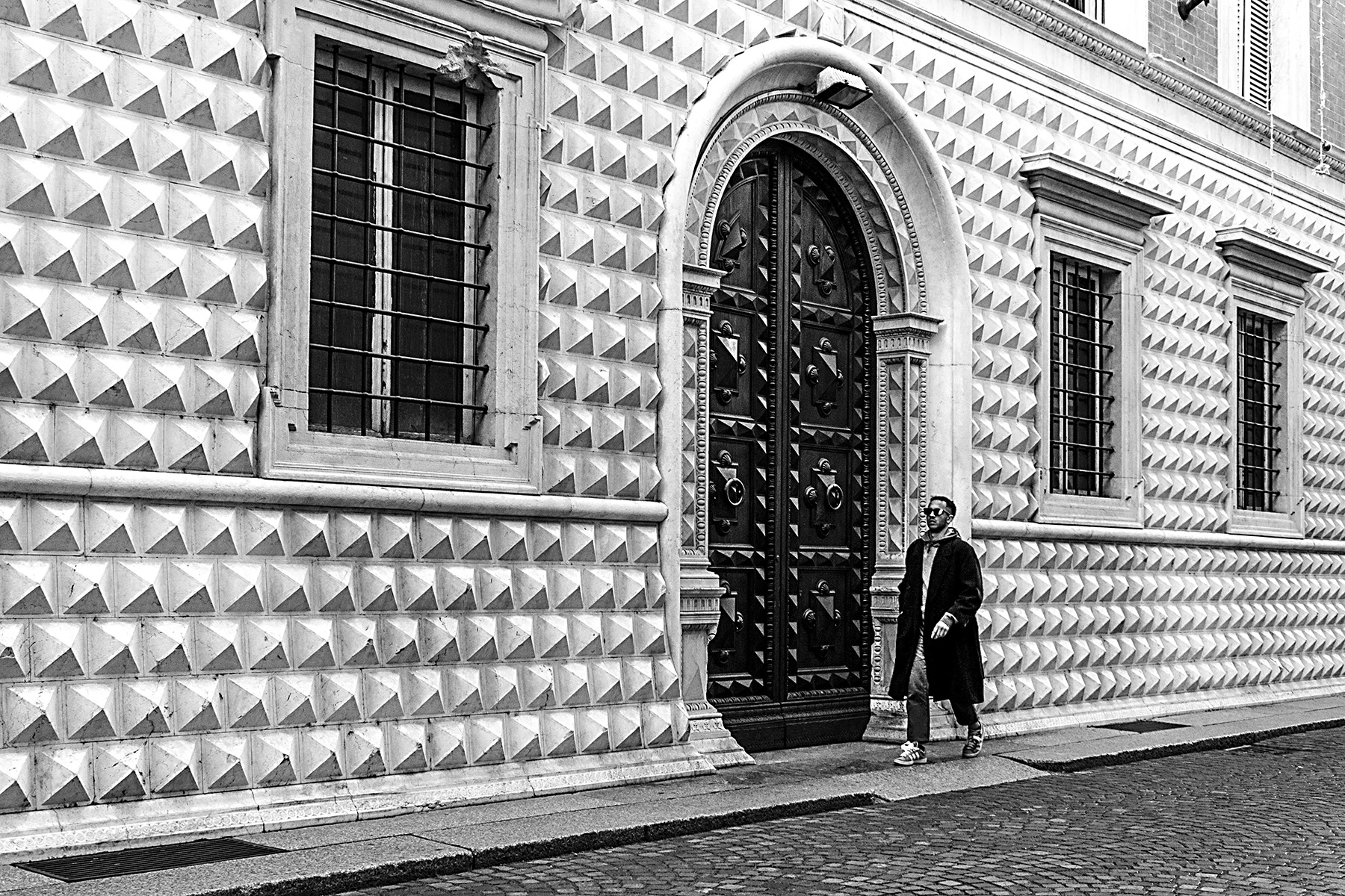 Pur non essendoci richiami diretti tra le bugne del palazzo (ma non è Ferrara…?) e il passante, trovo molto riuscito questo accostamento, valorizzato dal bianco e nero deciso e contrastato Per me buona