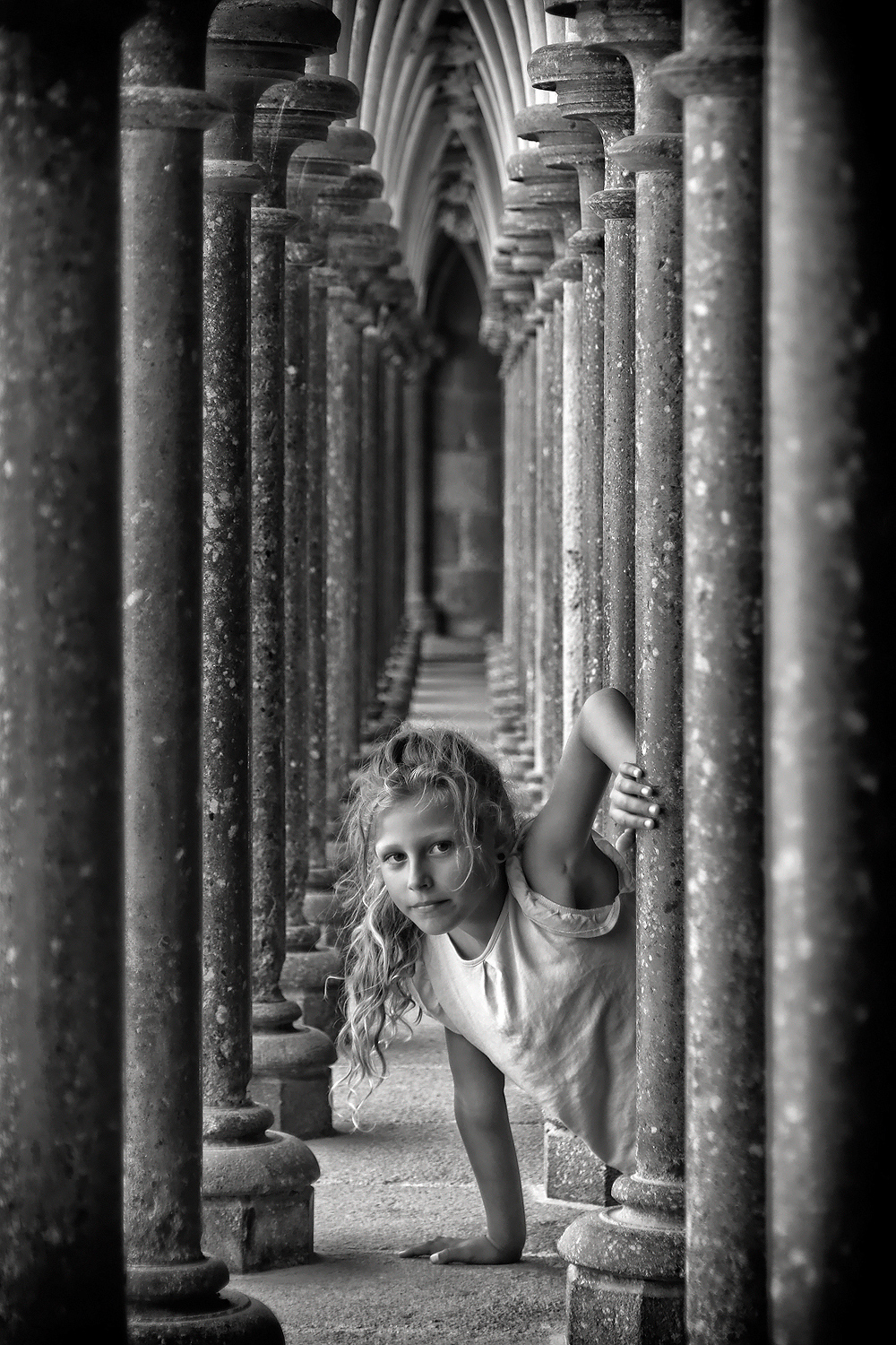 Perfettamente incorniciata la bambina all'interno della stretta fuga di colonne del chiostro.