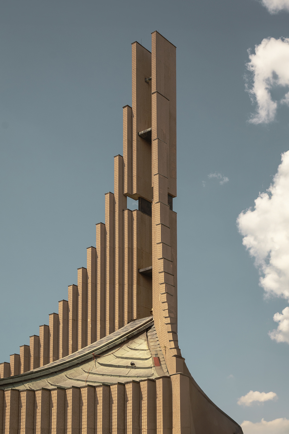 Straniante, sembra bidimensionale, non si riesce a capire l’effettiva conformazione della struttura… ma proprio per questo è affascinante Buona la composizione con le nuvole che fanno capolino e bella anche la lavorazione in post… insomma mi piace!