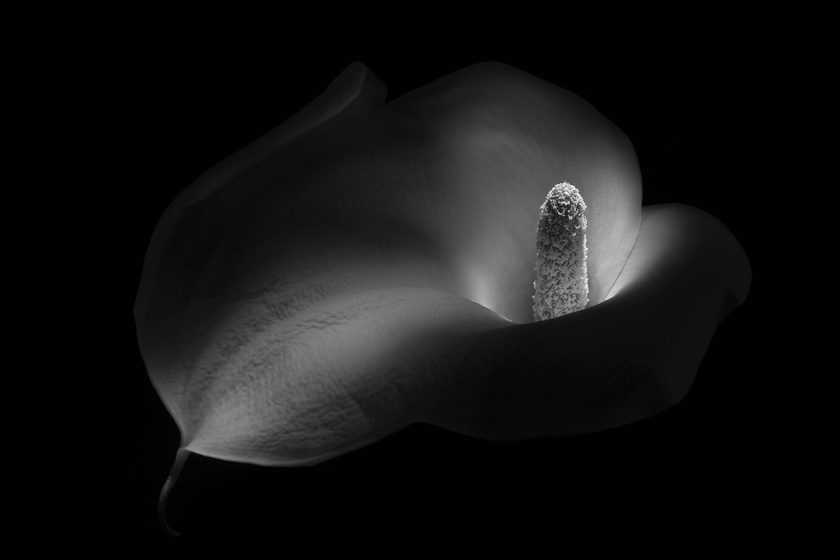 Un’illuminazione fantastica, focalizzata sul pistillo della calla, che sembra emergere dal buio e avere vita propria… Bellissima proposta, efficace anche il, bianco e nero Complimenti!