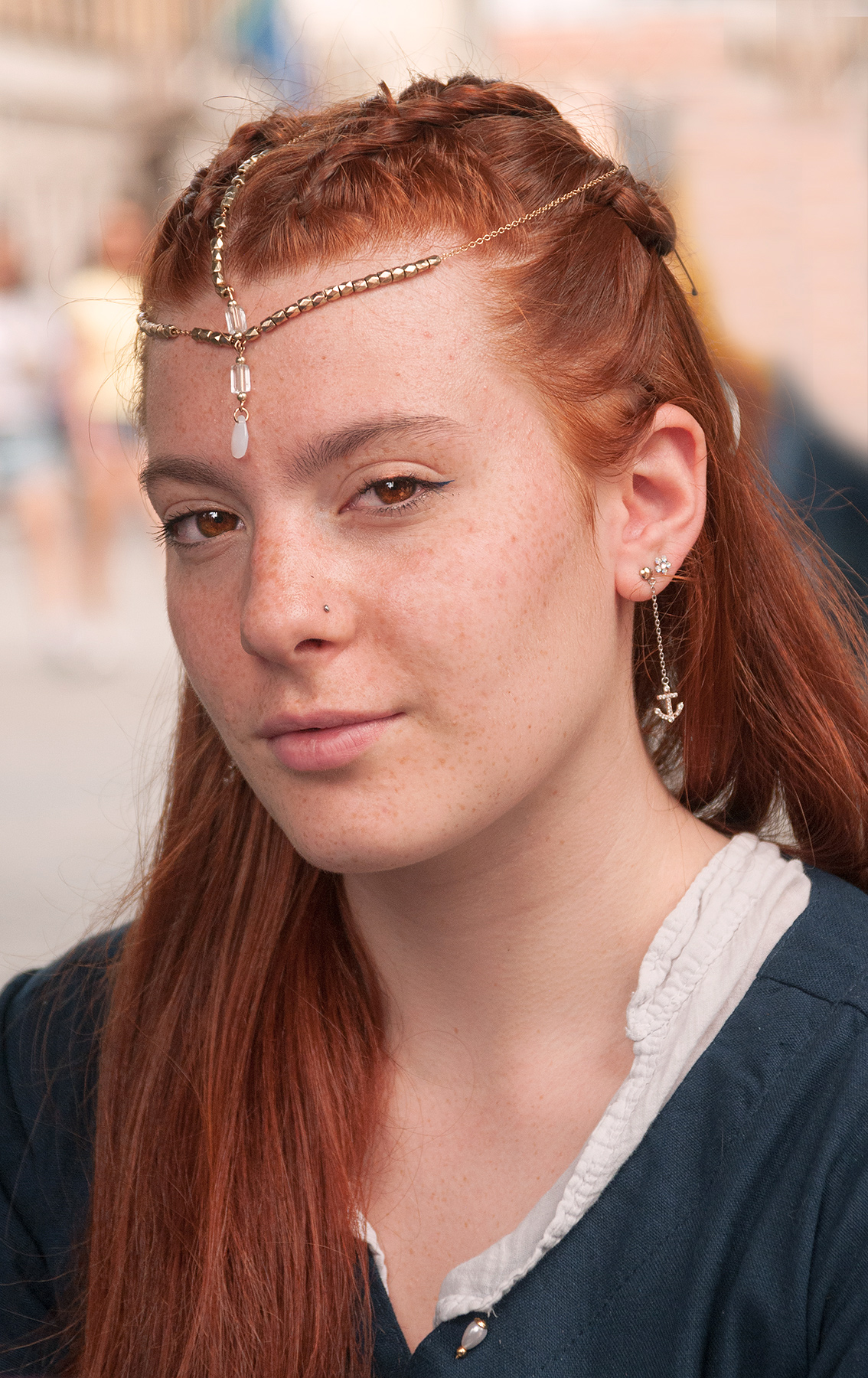 Bellissimo ritratto, a cui lo sguardo dolcemente malizioso di questa pulzella alto-medioevale conferisce una notevole forza. Il taglio a primo piano classico è formalmente corretto, direi da manuale. Senz'altro, visto l'abbigliamento, ci sarebbe stato bene anche un mezzo busto, ma se c'erano molti disturbi sulla scena, hai fatto la scelta giusta. Efficace anche la catch light riflessa dalle iridi, non so se naturale o artificiale, ma comunque molto gradevole: enfatizza lo sguardo da birichina