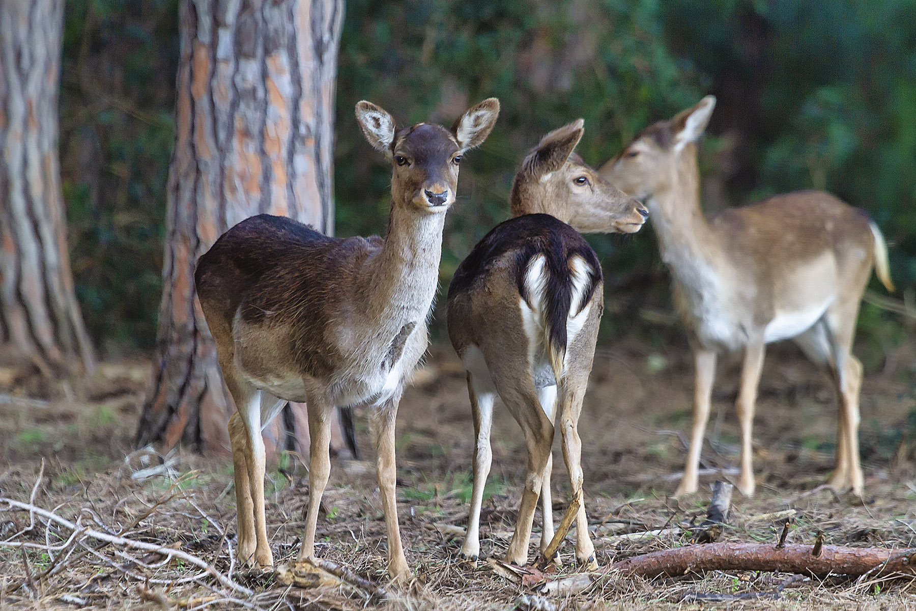Lo sfondo sembra un vetro smerigliato ma è comunque piacevole. Ben ripresi questi che immagino essere femmine di daino.... avrei visto un filino di spazio in più sotto gli zoccoli.