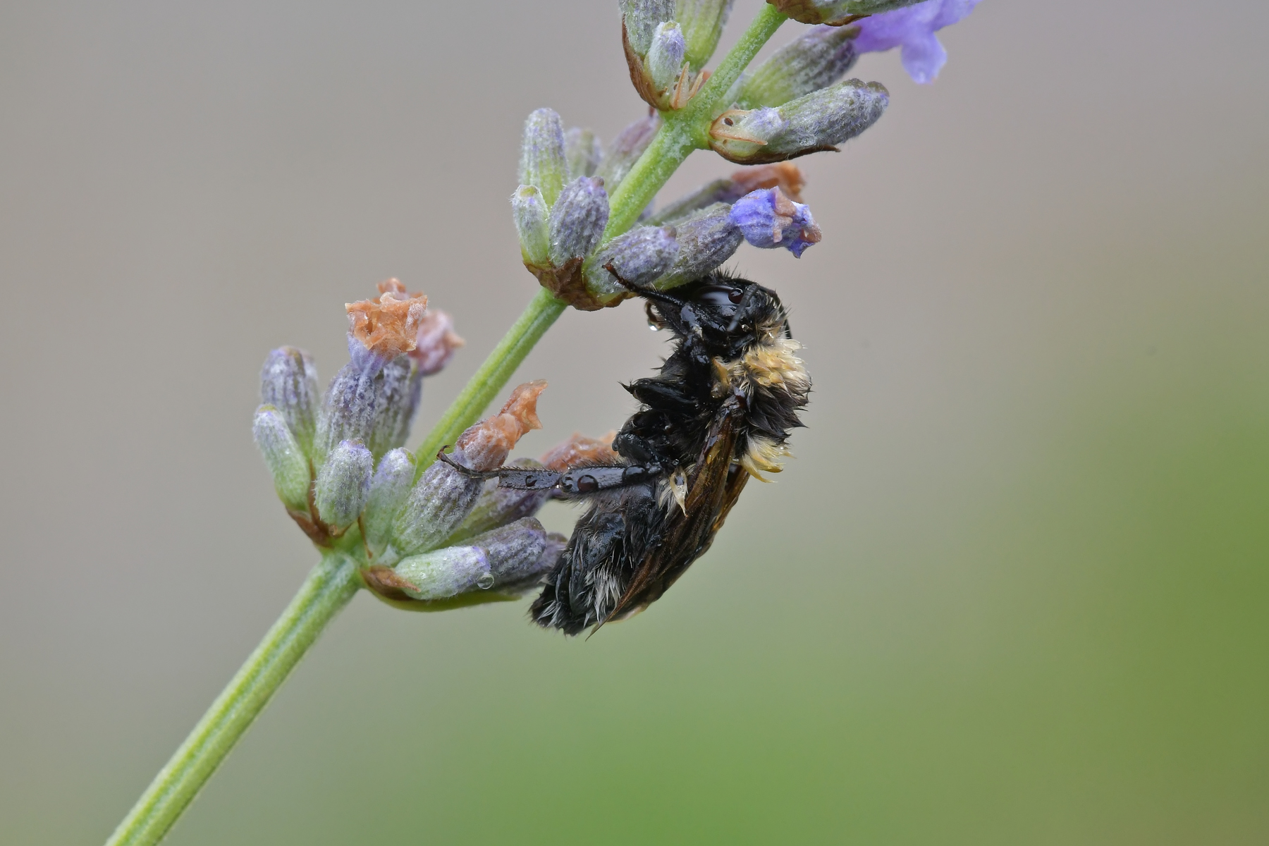 Mi gioco quattro immagini in un solo intervento. Temporale, vado a vedere cosa resta dei cespugli di lavanda. Vedo questo imenottero immobile e mezzo morto. Non ho altro che il mio alito e comincio a riscaldarlo con il respiro. Comincia a muoversi lentamente, la testa, l'addome le ali. L'ho lasciato dopo una mezz'ora che cominciava a far rullare il motore.