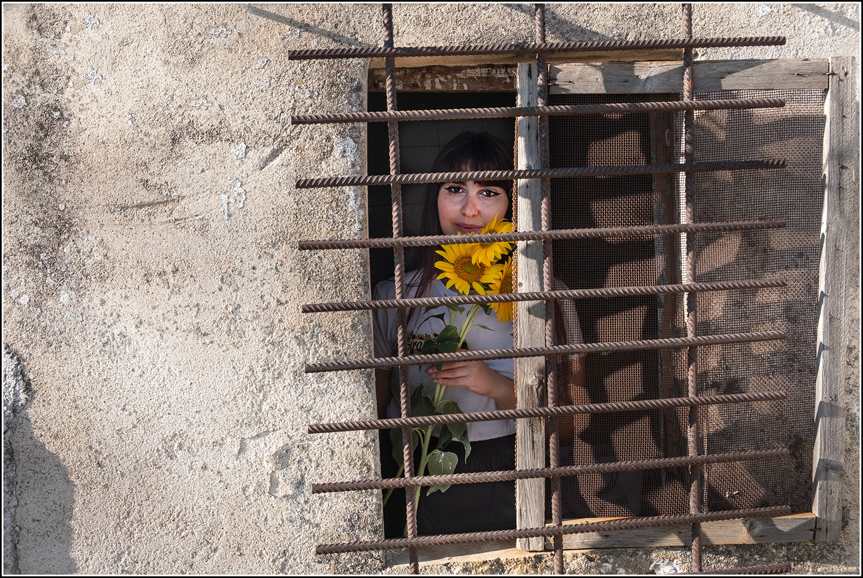 Una bella contraddizione quella che si viene a creare tra l' opprimente sensazione che quelle sbarre offrono e la spensieratezza e la vita che i girasoli rappresentano... Accompagnati dal suo sorriso gentile che sembra più vivere quest' ultima sensazione che lasciarsi spegnere dalla prigionia. Un ritratto che regala speranza... Mi piace  _________________