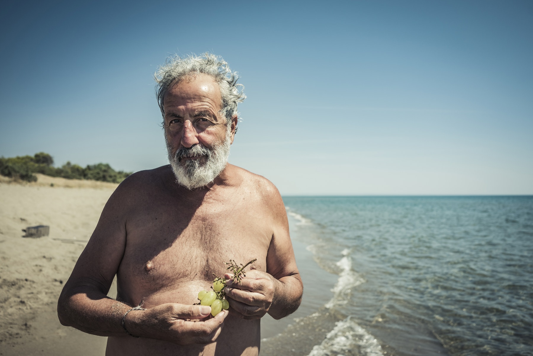 Sguardo autentico, forte e delicato insieme, su questa persona esposta al sole diretto che si prende energia da dei semplici chicchi l'uva. Ennesima buona foto di spiaggia, con i coerenti e consueti colori lievemente sommesso, con un risultato di valore e buon gusto fotografico. Ciao, Francesco