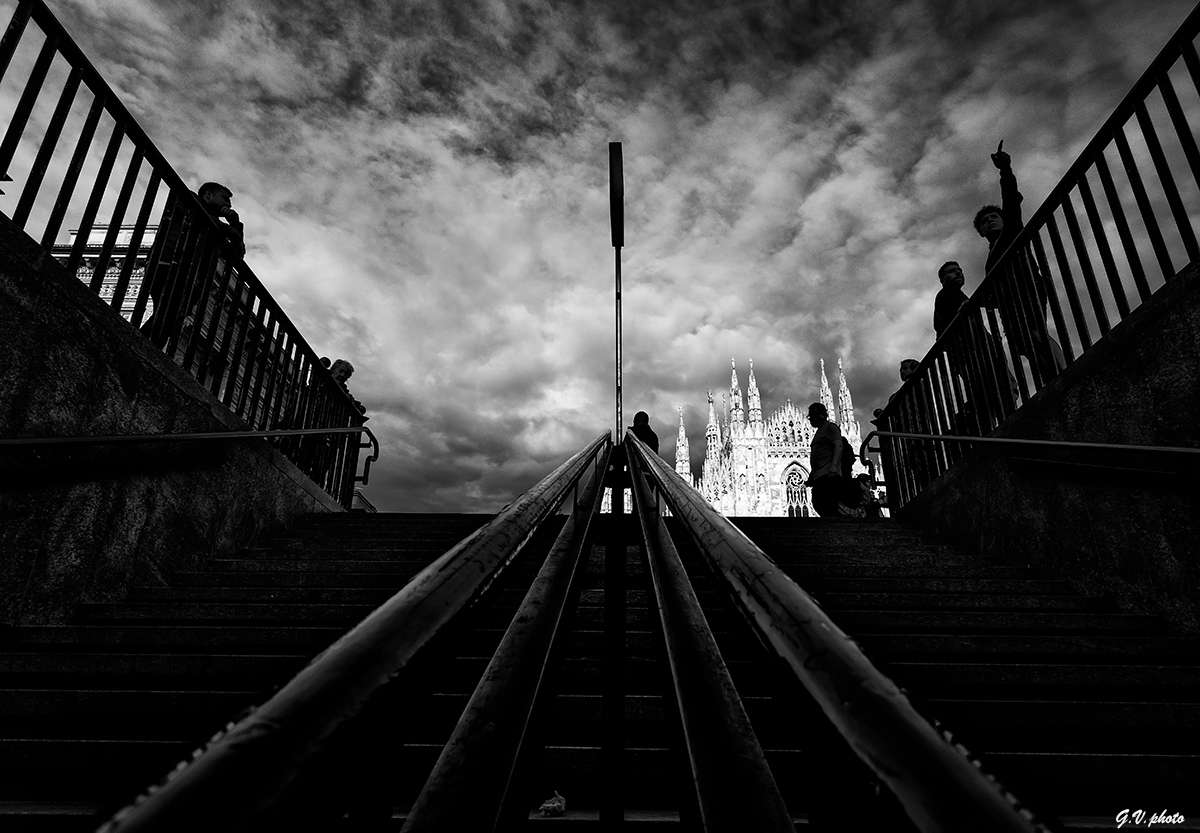 Un po’ tirata per architettura, ma l’immagine è sicuramente di grande impatto… Buona composizione ed efficace uso del bianco e nero, con il duomo che emerge luminoso da una scena cupa… Collaborativo anche il cielo Molto bella, complimenti!
