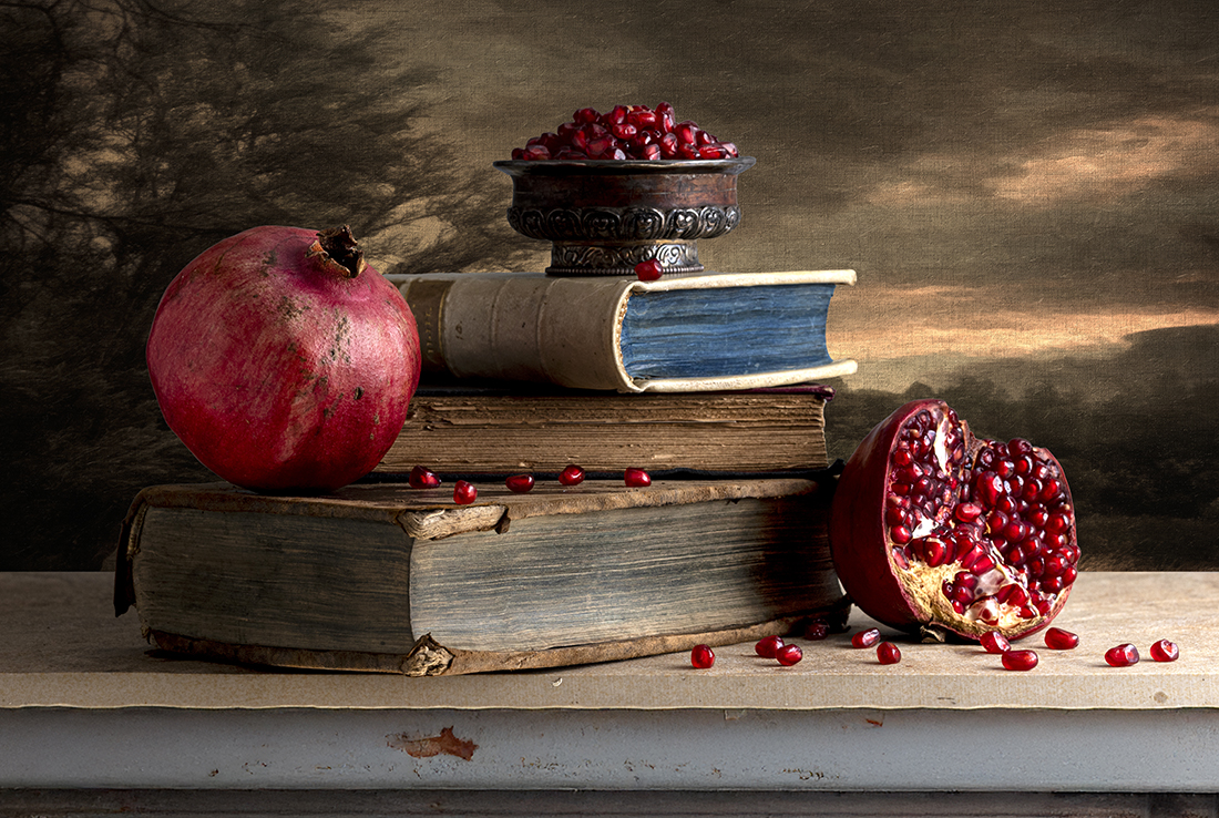Bella l'accoppiata melograni/libri: il simbolo della fertilità vale anche per la mente...