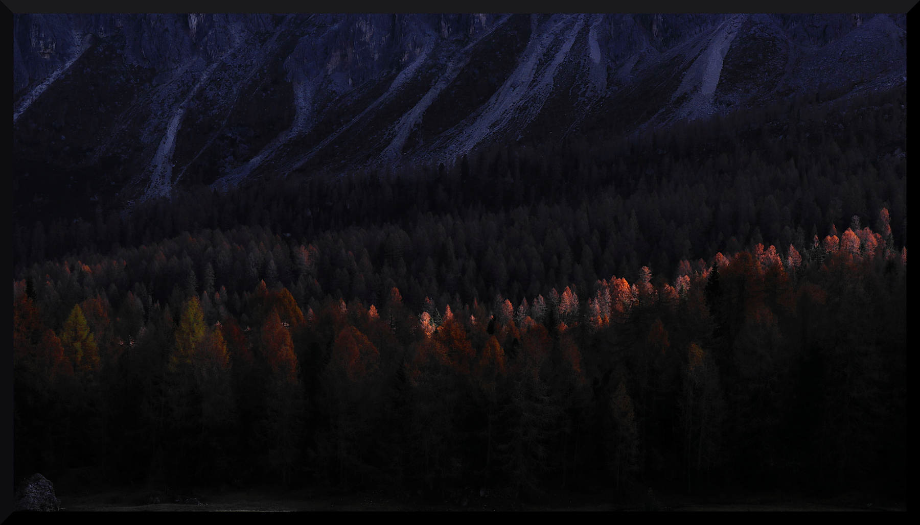 un'immagine molto affascinante con le prime luci che illuminano solo la cima dei larici, prima dell'esplosione di luce e colori. Mi piace parecchio