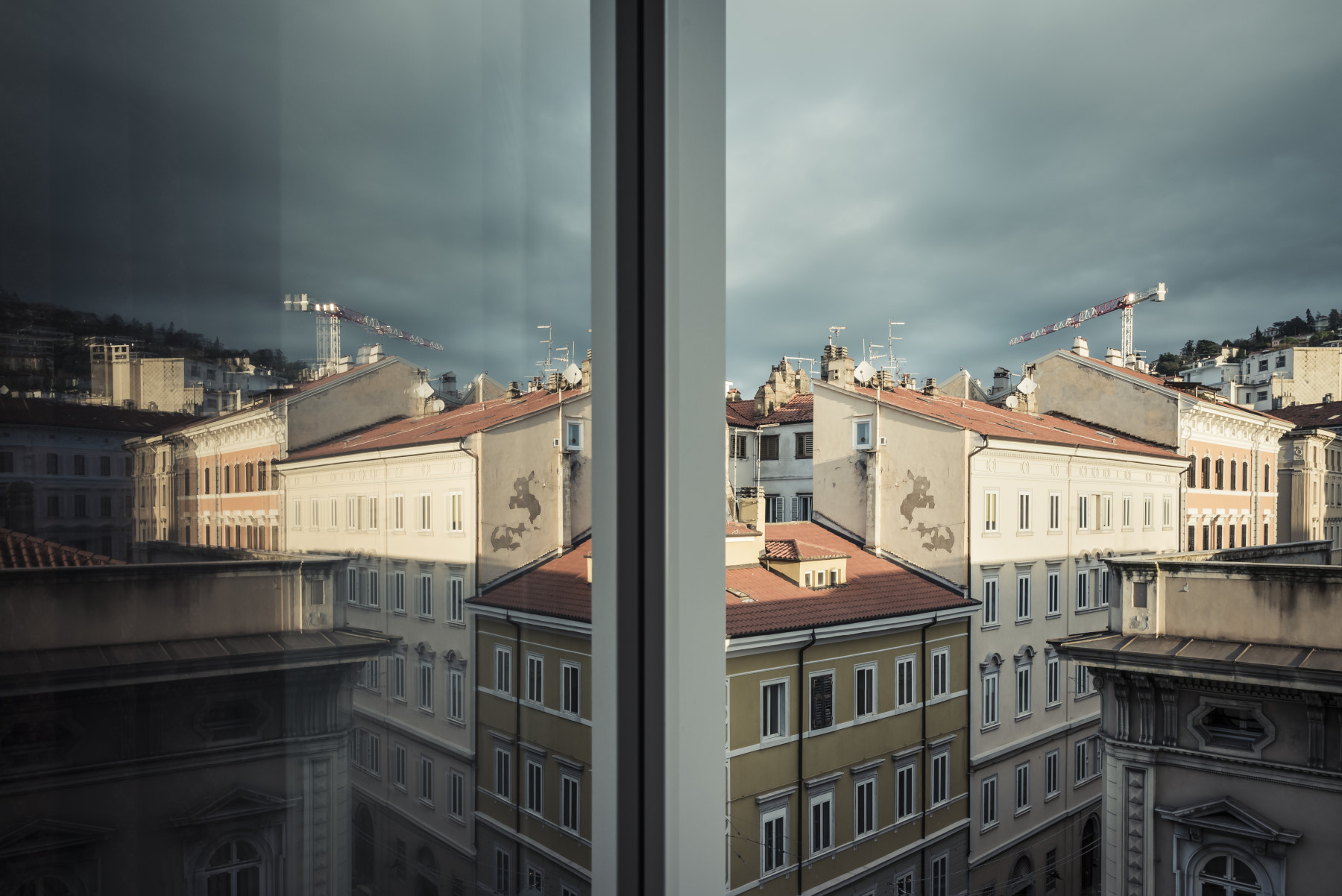 Bel paesaggio urbano specchiato, con fantastici contrasti/accostamenti cromatici Mi piace molto