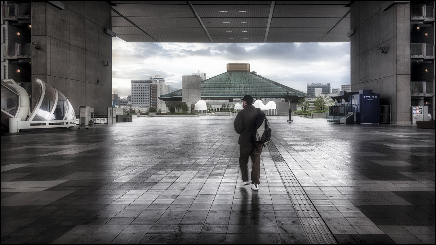 Ma la solitudine della persona viene colta oltre che dall'ampiezza dello spazio circostante dalle grandi strutture sullo sfondo.
