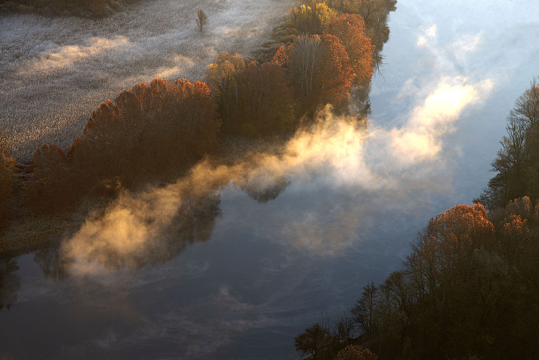 Ottimo il contrasto cromatico tra le tonalità calde degli alberi, quelle fredde dell'acqua e la brina del campo.