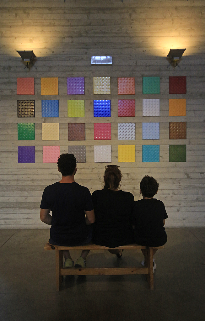 Colpisce il perfetto digradare delle teste in contrasto con l'ortogonalità dei quadrati colorati.