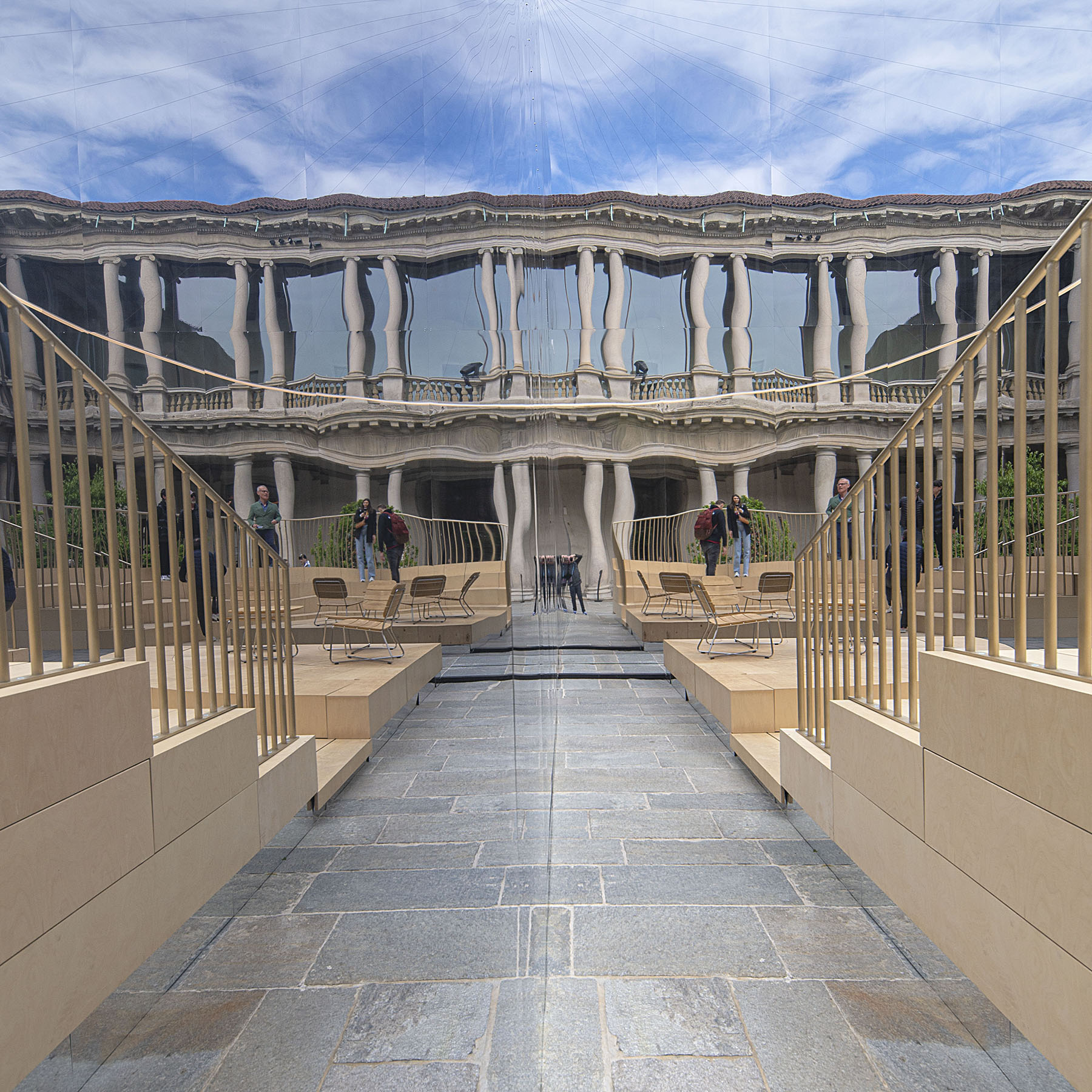 I corrimani in primo piano introducono e guidano lo sguardo verso lo sfondo distorto creando un effetto surreale.