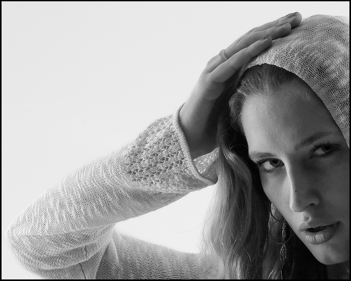 Mi piace molto, la posa , lo sguardo... Il taglio, si, anche ... Anche se a dirla tutta, vedendo anche lo scatto non croppato, a mio personalissimo gusto, credo che la soluzione più efficace sarebbe stata una via di mezzo sai? Tagliando più a filo del cappuccio..