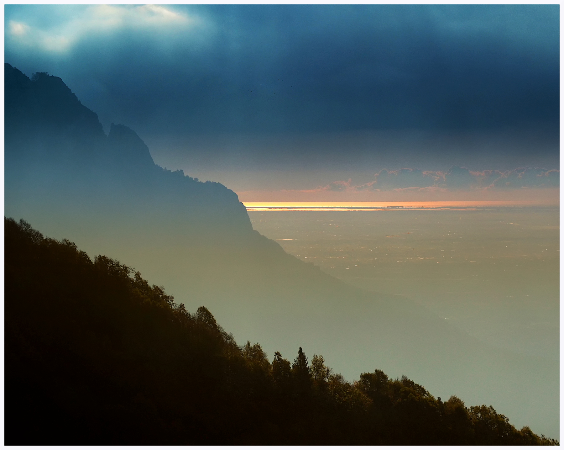 Panorama mattutino dal Monte Cengio 1300m, Altipiano di Asiago, con vista sulla pianura veneta, sulla Laguna di Venezia e l'Adriatico a 85 km di distanza. Ottobre 2024 _________________ Fotocamere Olympus OMD e PEN, Panasonic G3. Software GIMP