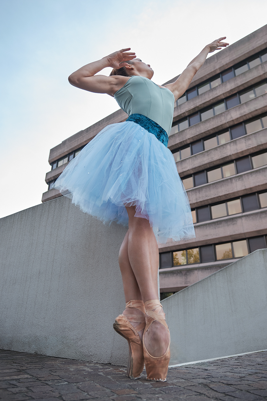 Straniante la sensazione generale della foto che viene fuori, bellissima e delicata la ballerina; per posa e per il colore delicatissimo del tutù che si abbina al cielo.