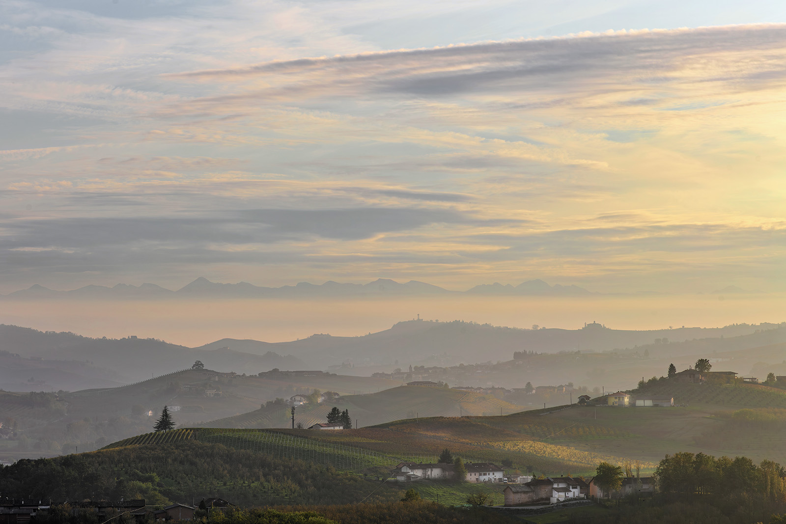 Molto piacevole, lo sguardo va dal primo piano cavalcando la serie di colline su diversi piani focali fin sul fondo, e poi su per quel cielo variegato di colori.