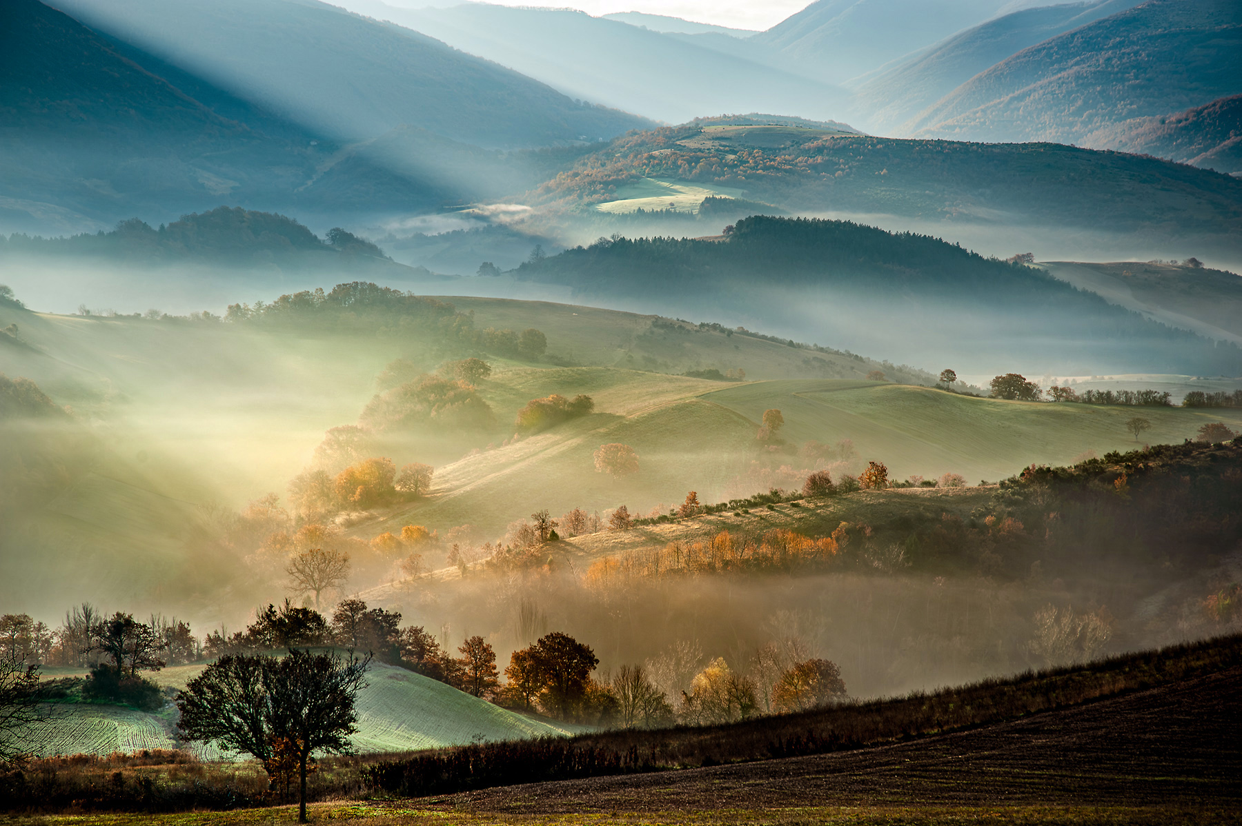 Notevoli le fasce di luce che inondano lateralmente il paesaggio, così come le colline che si susseguono con loro colori diversissimi